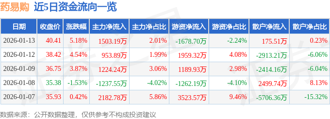 证券之星消息,截至2026年1月13日收盘,药易购(300937)报收于40.41元,上涨5.18%,换手率29.23%,成交量18.39万手,成交额7.49亿元。