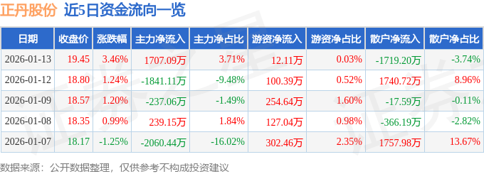 证券之星消息,截至2026年1月13日收盘,正丹股份(300641)报收于19.45元,上涨3.46%,换手率4.47%,成交量23.48万手,成交额4.6亿元。