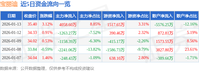 证券之星消息,截至2026年1月13日收盘,宝丽迪(300905)报收于35.4元,上涨3.12%,换手率9.16%,成交量12.74万手,成交额4.59亿元。
