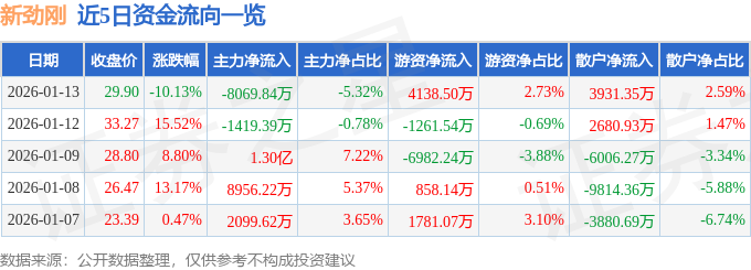 证券之星消息,截至2026年1月13日收盘,新劲刚(300629)报收于29.9元,下跌10.13%,换手率23.3%,成交量50.52万手,成交额15.18亿元。