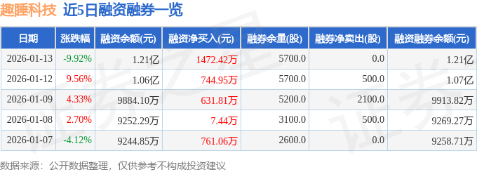 趣睡科技融资融券信息显示,融资方面,当日融资买入4749.29万元,融资偿还3276.86万元,融资净买入1472.42万元,连续3日净买入累计2849.18万元。融券方面,融券卖出0.0股,融券偿还0.0股,融券余量5700.0股,融券余额32.14万元。融资融券余额1.21亿元。