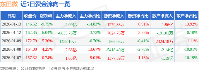 证券之星消息,截至2026年1月13日收盘,东田微(301183)报收于146.52元,下跌9.75%,换手率15.67%,成交量9.2万手,成交额14.08亿元。