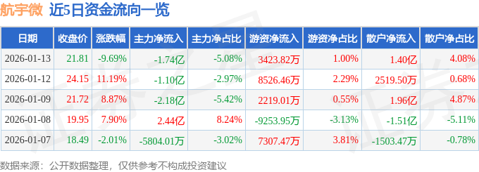 证券之星消息,截至2026年1月13日收盘,航宇微(300053)报收于21.81元,下跌9.69%,换手率23.32%,成交量151.77万手,成交额34.23亿元。