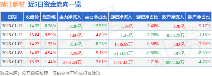 证券之星消息,截至2026年1月13日收盘,楚江新材(002171)报收于14.33元,下跌8.38%,换手率14.74%,成交量237.89万手,成交额34.87亿元。