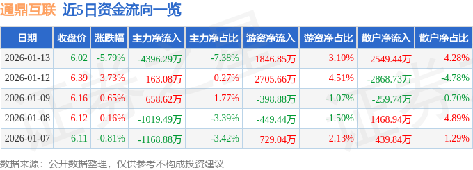证券之星消息,截至2026年1月13日收盘,通鼎互联(002491)报收于6.02元,下跌5.79%,换手率8.28%,成交量97.38万手,成交额5.96亿元。