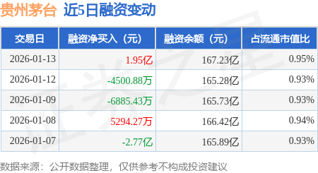 证券之星消息,1月13日,贵州茅台(600519)融资买入4.85亿元,融资偿还2.9亿元,融资净买入1.95亿元,融资余额167.23亿元,当日融资净买入排名第34。