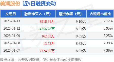 证券之星消息,1月13日,美湖股份(603319)融资买入2.79亿元,融资偿还1.9亿元,融资净买入8916.91万元,融资余额9.1亿元,近20个交易日中有13个交易日出现融资净买入。