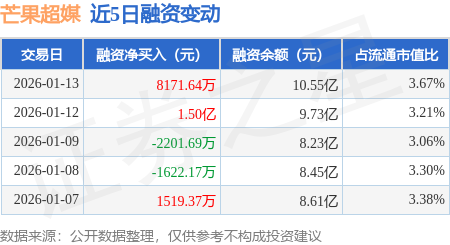 证券之星消息,1月13日,芒果超媒(300413)融资买入3.57亿元,融资偿还2.75亿元,融资净买入8171.64万元,融资余额10.55亿元,近20个交易日中有12个交易日出现融资净买入。