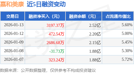 证券之星消息,1月13日,嘉和美康(688246)融资买入1.25亿元,融资偿还9352.21万元,融资净买入3197.37万元,融资余额2.52亿元,近3个交易日已连续净买入累计6356.59万元。
