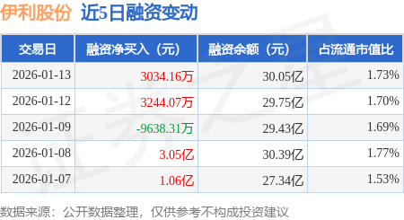 证券之星消息,1月13日,伊利股份(600887)融资买入1.5亿元,融资偿还1.19亿元,融资净买入3034.16万元,融资余额30.05亿元。