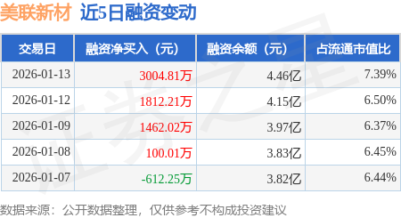 证券之星消息,1月13日,美联新材(300586)融资买入7603.52万元,融资偿还4598.71万元,融资净买入3004.81万元,融资余额4.46亿元,近3个交易日已连续净买入累计6279.04万元,近20个交易日中有11个交易日出现融资净买入。