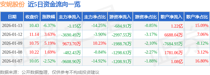 1月13日的资金流向数据方面,主力资金净流出1.15亿元,占总成交额14.25%,游资资金净流出684.91万元,占总成交额0.85%,散户资金净流入1.22亿元,占总成交额15.09%。