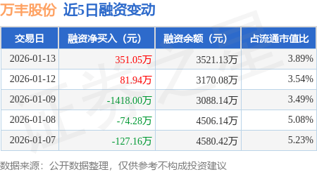 证券之星消息,1月13日,万丰股份(603172)融资买入708.32万元,融资偿还357.27万元,融资净买入351.05万元,融资余额3521.13万元,近20个交易日中有11个交易日出现融资净买入。