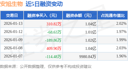 证券之星消息,1月13日,安旭生物(688075)融资买入859.81万元,融资偿还548.99万元,融资净买入310.82万元,融资余额1.04亿元。