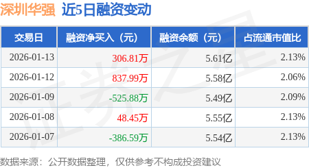 证券之星消息,1月13日,深圳华强(000062)融资买入4266.54万元,融资偿还3959.74万元,融资净买入306.81万元,融资余额5.61亿元。