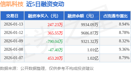 证券之星消息,1月13日,信凯科技(001335)融资买入2310.97万元,融资偿还2063.74万元,融资净买入247.23万元,融资余额9934.09万元。