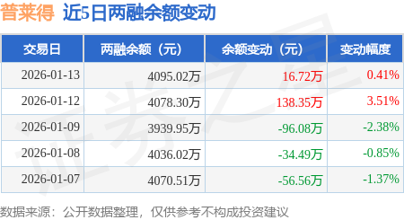 证券之星消息,1月13日,普莱得(301353)融资买入569.67万元,融资偿还552.95万元,融资净买入16.72万元,融资余额4095.02万元,近20个交易日中有11个交易日出现融资净买入。
