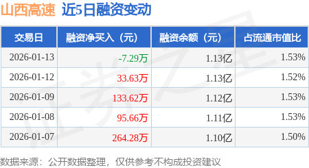 证券之星消息,1月13日,山西高速(000755)融资买入517.12万元,融资偿还524.41万元,融资净卖出7.29万元,融资余额1.13亿元,近20个交易日中有12个交易日出现融资净买入。