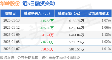 证券之星消息,1月13日,华岭股份(920139)融资买入414.25万元,融资偿还530.13万元,融资净卖出115.88万元,融资余额6139.76万元。