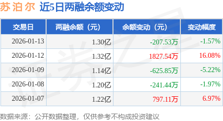 证券之星消息,1月13日,苏 泊 尔(002032)融资买入760.9万元,融资偿还993.32万元,融资净卖出232.42万元,融资余额1.28亿元,近20个交易日中有14个交易日出现融资净买入。