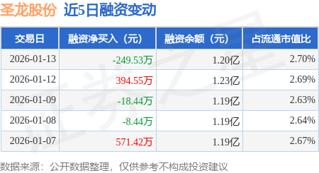 证券之星消息,1月13日,圣龙股份(603178)融资买入1120.04万元,融资偿还1369.57万元,融资净卖出249.53万元,融资余额1.2亿元。