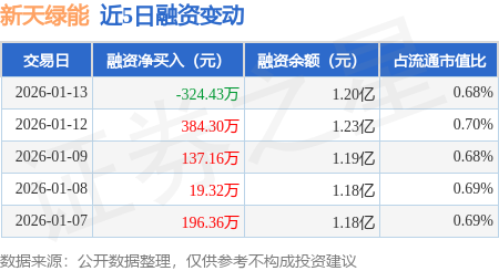 证券之星消息,1月13日,新天绿能(600956)融资买入1405.77万元,融资偿还1730.21万元,融资净卖出324.43万元,融资余额1.2亿元,近20个交易日中有11个交易日出现融资净买入。