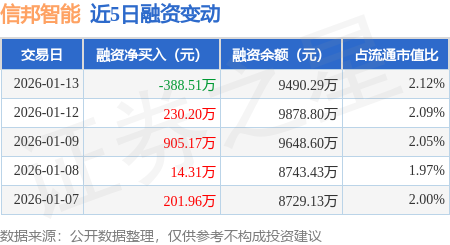 证券之星消息,1月13日,信邦智能(301112)融资买入1279.27万元,融资偿还1667.78万元,融资净卖出388.51万元,融资余额9490.29万元,近20个交易日中有11个交易日出现融资净买入。