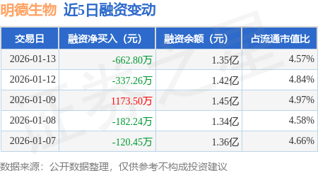 证券之星消息,1月13日,明德生物(002932)融资买入1871.7万元,融资偿还2534.5万元,融资净卖出662.8万元,融资余额1.35亿元。