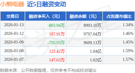 证券之星消息,1月13日,小熊电器(002959)融资买入809.96万元,融资偿还1613.9万元,融资净卖出803.94万元,融资余额8993.1万元。