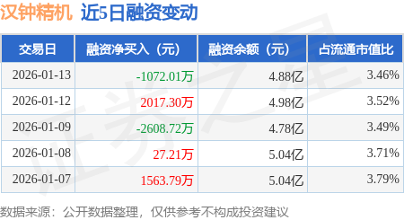 证券之星消息,1月13日,汉钟精机(002158)融资买入2969.23万元,融资偿还4041.24万元,融资净卖出1072.01万元,融资余额4.88亿元,近20个交易日中有13个交易日出现融资净买入。