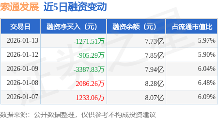证券之星消息,1月13日,索通发展(603612)融资买入4957.19万元,融资偿还6228.7万元,融资净卖出1271.51万元,融资余额7.73亿元。