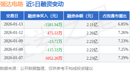 证券之星消息,1月13日,强达电路(301628)融资买入4053.94万元,融资偿还5635.88万元,融资净卖出1581.94万元,融资余额2.11亿元,近20个交易日中有12个交易日出现融资净买入。