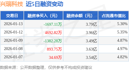 证券之星消息,1月13日,兴瑞科技(002937)融资买入1242.59万元,融资偿还2939.69万元,融资净卖出1697.11万元,融资余额3.79亿元,近20个交易日中有13个交易日出现融资净买入。