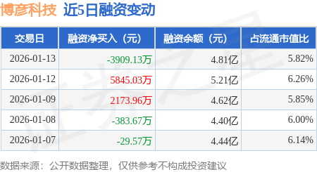 证券之星消息,1月13日,博彦科技(002649)融资买入1.15亿元,融资偿还1.54亿元,融资净卖出3909.13万元,融资余额4.81亿元。