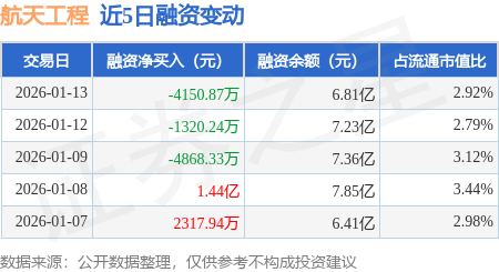证券之星消息,1月13日,航天工程(603698)融资买入9588.43万元,融资偿还1.37亿元,融资净卖出4150.87万元,融资余额6.81亿元,近20个交易日中有11个交易日出现融资净买入。