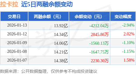 证券之星消息,1月13日,拉卡拉(300773)融资买入3.22亿元,融资偿还3.64亿元,融资净卖出4195.76万元,融资余额13.88亿元,近20个交易日中有15个交易日出现融资净买入。