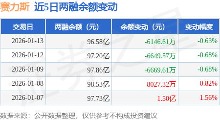 证券之星消息,1月13日,赛力斯(601127)融资买入4.04亿元,融资偿还4.66亿元,融资净卖出6132.83万元,融资余额96.42亿元。