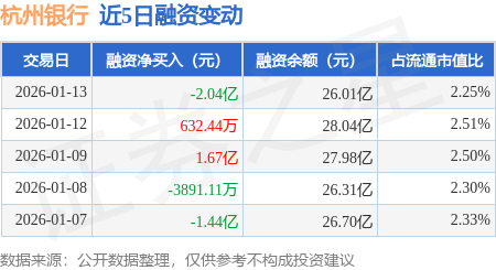 证券之星消息,1月13日,杭州银行(600926)融资买入1.01亿元,融资偿还3.05亿元,融资净卖出2.04亿元,融资余额26.01亿元。
