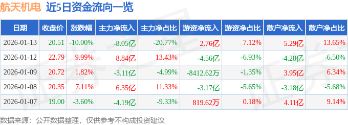 1月13日的资金流向数据方面,主力资金净流出8.05亿元,占总成交额20.77%,游资资金净流入2.76亿元,占总成交额7.12%,散户资金净流入5.29亿元,占总成交额13.65%。