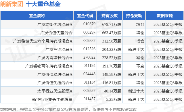 根据2025基金Q3季报公募基金重仓股数据,重仓该股的公募基金共11家,其中持有数量最多的公募基金为广发基金的广发均衡优选混合A。广发均衡优选混合A目前规模为22.82亿元,最新净值0.9572(1月13日),较上一交易日下跌1.73%,近一年下跌2.1%。该公募基金现任基金经理为王明旭。王明旭在任的基金产品包括:广发内需增长混合A,管理时间为2018年10月17日至今,期间收益率为131.23%;广发价值优势混合,管理时间为2020年3月2日至今,期间收益率为32.81%;广发稳健优选六个月持有期混合A,管理时间为2020年8月6日至今,期间收益率为5.73%;