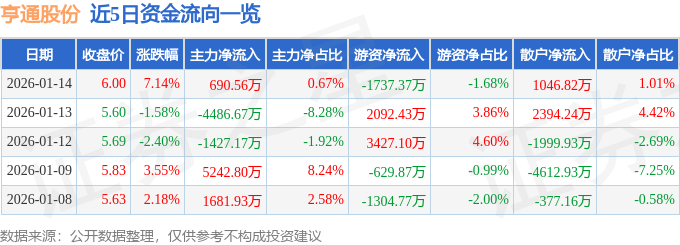 证券之星消息,截至2026年1月14日收盘,亨通股份(600226)报收于6.0元,上涨7.14%,换手率5.89%,成交量175.05万手,成交额10.32亿元。