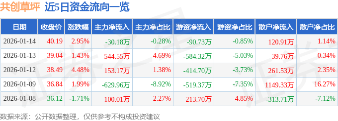 证券之星消息,截至2026年1月14日收盘,共创草坪(605099)报收于40.19元,上涨2.95%,换手率0.67%,成交量2.68万手,成交额1.06亿元。