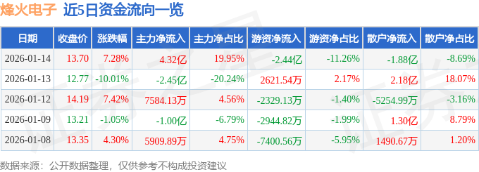 证券之星消息,截至2026年1月14日收盘,烽火电子(000561)报收于13.7元,上涨7.28%,换手率22.25%,成交量159.4万手,成交额21.64亿元。