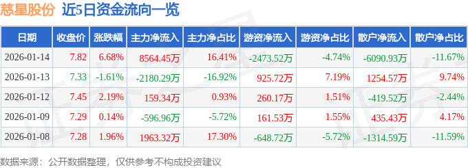 证券之星消息,截至2026年1月14日收盘,慈星股份(300307)报收于7.82元,上涨6.68%,换手率8.55%,成交量67.44万手,成交额5.22亿元。