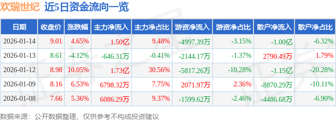 证券之星消息,截至2026年1月14日收盘,欢瑞世纪(000892)报收于9.01元,上涨4.65%,换手率24.49%,成交量174.12万手,成交额15.84亿元。