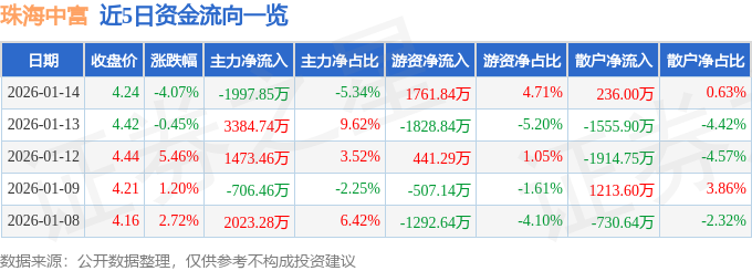 证券之星消息,截至2026年1月14日收盘,珠海中富(000659)报收于4.24元,下跌4.07%,换手率6.74%,成交量86.61万手,成交额3.74亿元。