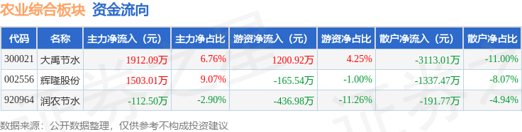 从资金流向上来看,当日农业综合板块主力资金净流入3415.1万元,游资资金净流入1035.38万元,散户资金净流出4450.48万元。农业综合板块个股资金流向见下表: