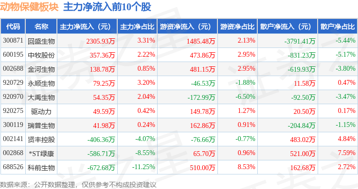 从资金流向上来看,当日动物保健板块主力资金净流出1.4亿元,游资资金净流入8809.61万元,散户资金净流入5213.78万元。动物保健板块个股资金流向见下表:
