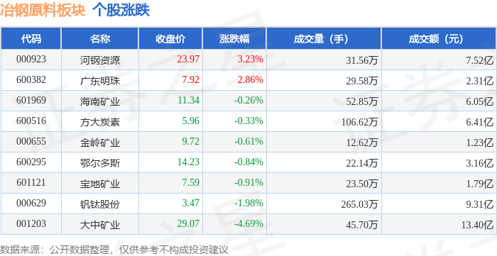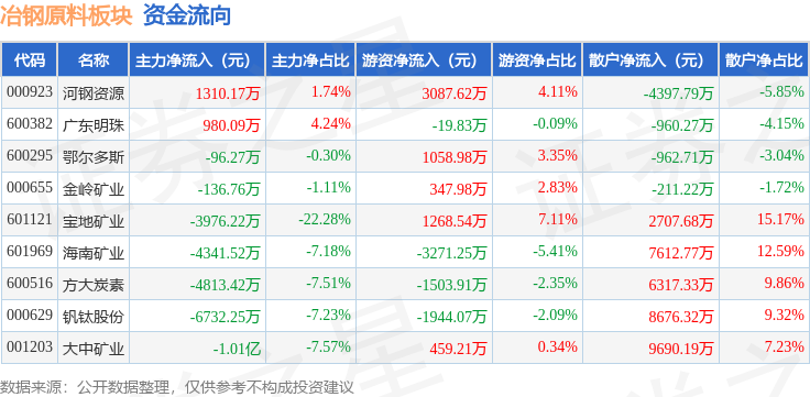从资金流向上来看,当日冶钢原料板块主力资金净流出2.8亿元,游资资金净流出516.74万元,散户资金净流入2.85亿元。冶钢原料板块个股资金流向见下表: