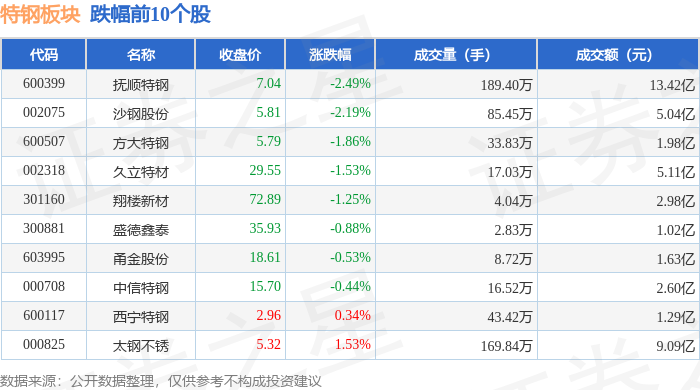 证券之星消息,1月14日特钢板块较上一交易日下跌0.31%,抚顺特钢领跌。当日上证指数报收于4126.09,下跌0.31%。深证成指报收于14248.6,上涨0.56%。特钢板块个股涨跌见下表: